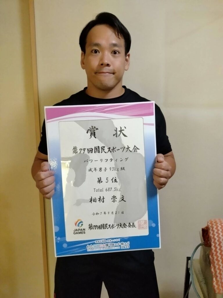 9月20日、21日に滋賀県で行われた、国民スポーツ大会のパワーリフティング競技にて、当院ご来院の、相村崇文さんが5位入賞の成績を収められました。